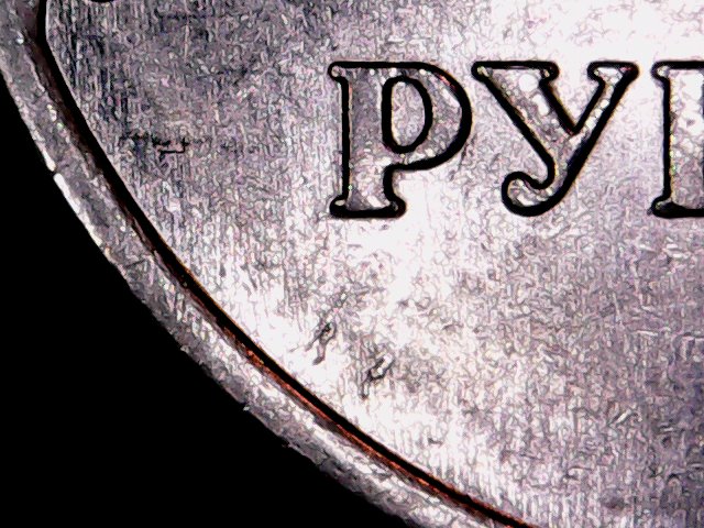 Впервые попался шт.5.42, поэтому немного сомневаюсь. Измерения от нижней части слова РУБЛЕЙ до верхней перекладины цифры 5 показали увеличение изображения на 2-3 пикселя. А измерение поля монеты от канта до канта, увеличение размера на 4-6 пикселей. Точнее у меня не получается измерить. По этому за основу определения взял дополнительную примету - выкрошка между буквой Р и кантом, как показано на изображении в каталоге. На мой взгляд всё совпадает.