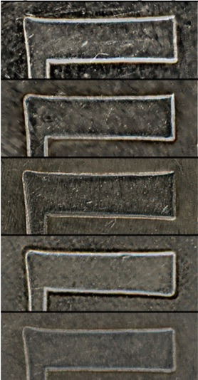 Вот такое различие по левому углу номинала встречается на монетах 5-ти рублёвого номинала 1997 и 1998 ммд .В 1997 (ммд) году встречаются чаще , а в 1998 (ммд) встречаются реже и носит устойчивый характер :