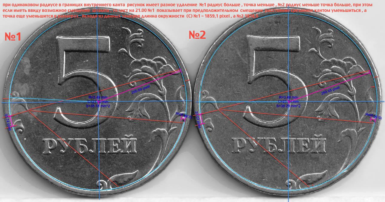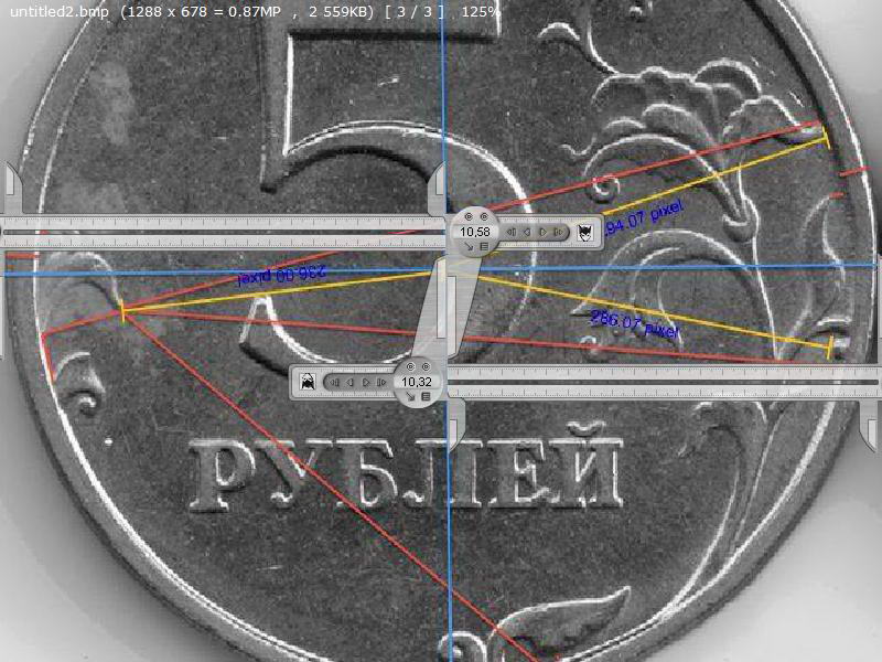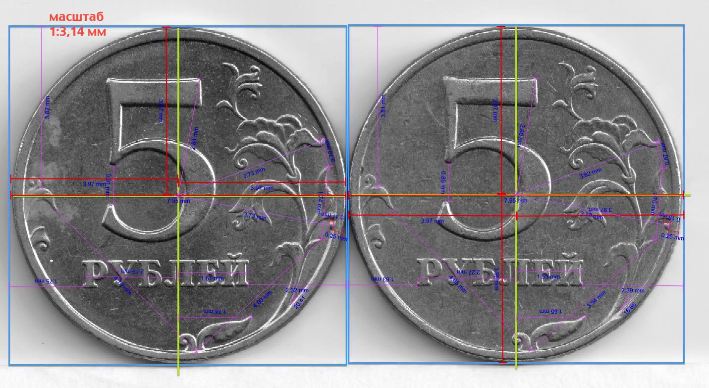 О Ваших "доках". Посмотрите вложение. Если изначально одна из отправных точек Ваших замеров (центр монеты) определена некорректно, то это ведет к нарастанию погрешности в последующих замерах и доками их назвать уже нельзя. Замеры до центральной линии делал от внешнего края монеты, потому как не оспаривается, что