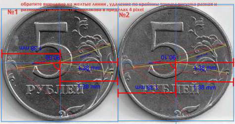 3. При восстановлении срезанной линии канта левой монеты в районе 13-16 часов , а путем не сложных замеров ширина канта становится одинакова, выходящая точка из крупной превращается в малую .