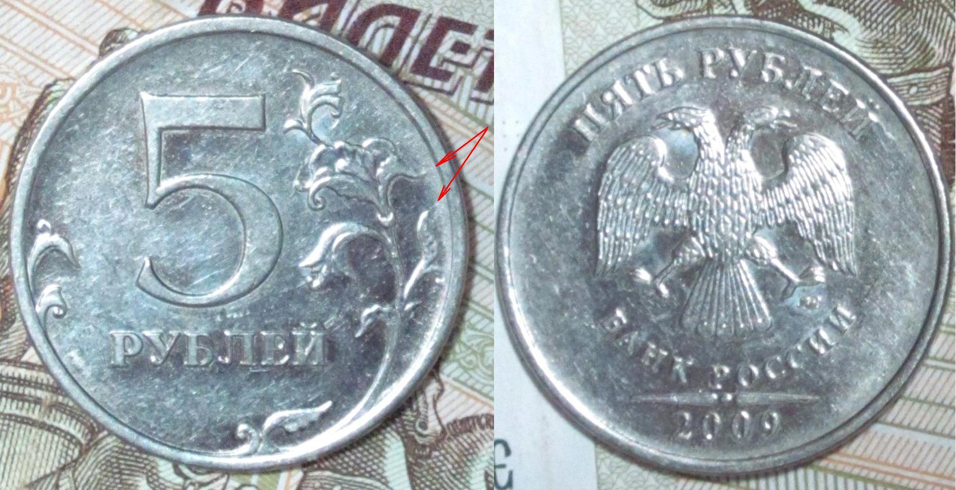 Попалась монетка 5 рублей 2009 магнитная, которая вызывает затруднения с определением и аверса, и реверса. Реверс похож на шт. 5.5, только то ли не прочекан, то ли другой рисунок (помечены стрелками). И вопрос по аверсу: это шт. Г или нет? Спасибо