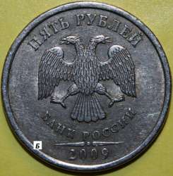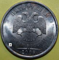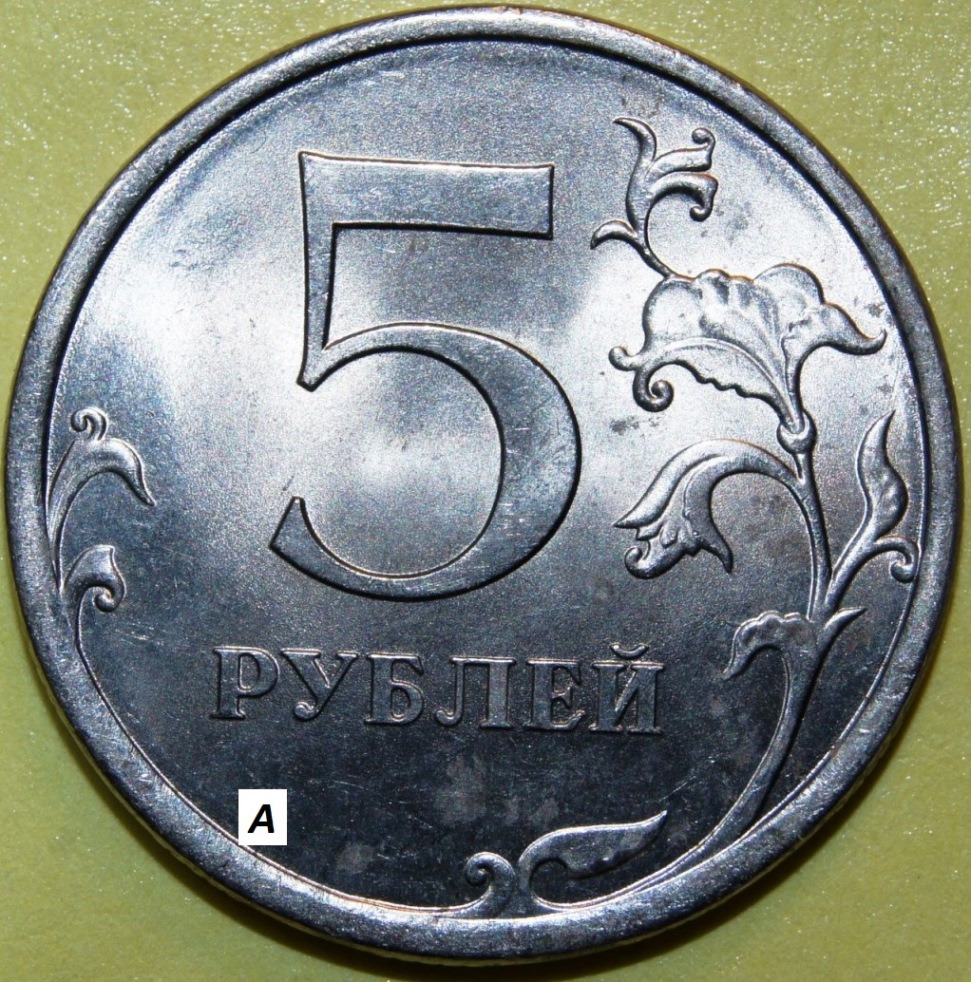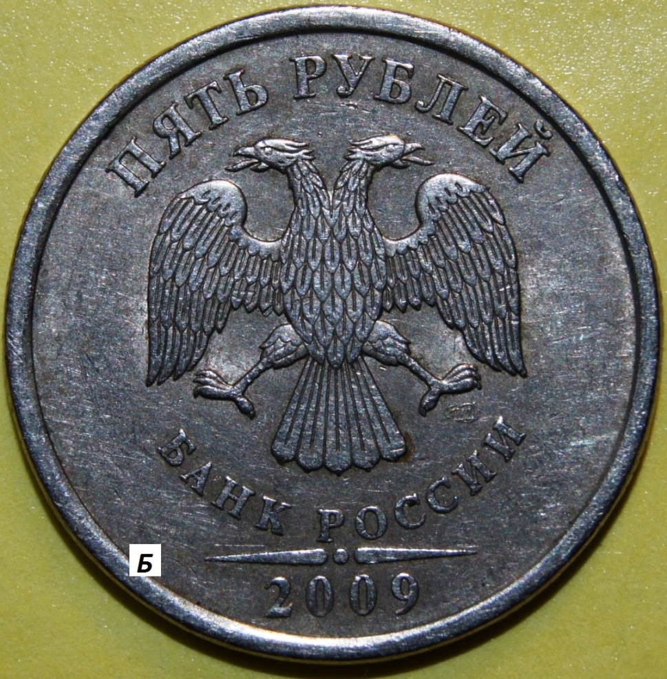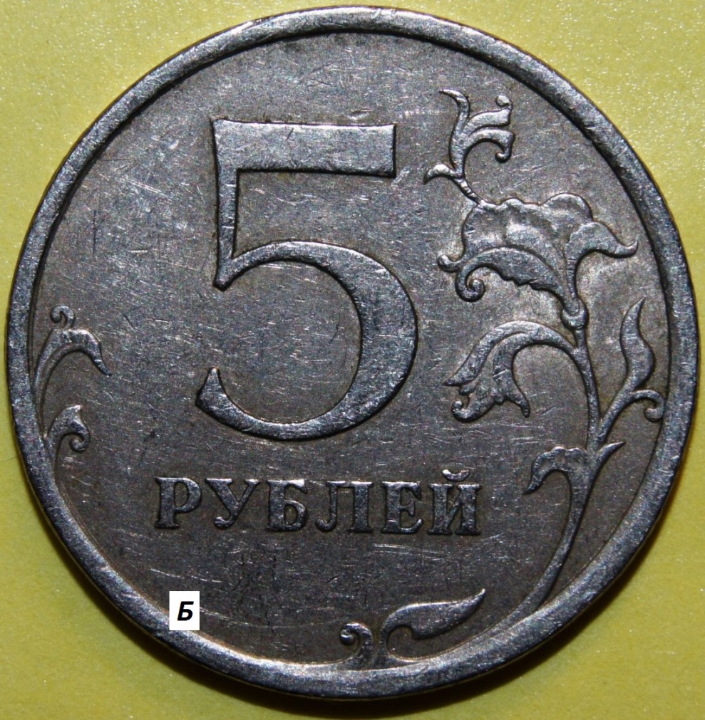 Уважаемы форумчане! Две пятирублевые монеты 2009 года СПМД старые (немагнитные) предположительно по реверсу шт. 5.22 имеют по двум ключевым элементам сходство, а по одному ключевому элементу отличие. На представленных фотографиях две монеты (назовем их монета А и монета Б), на их реверсах можно разглядеть: