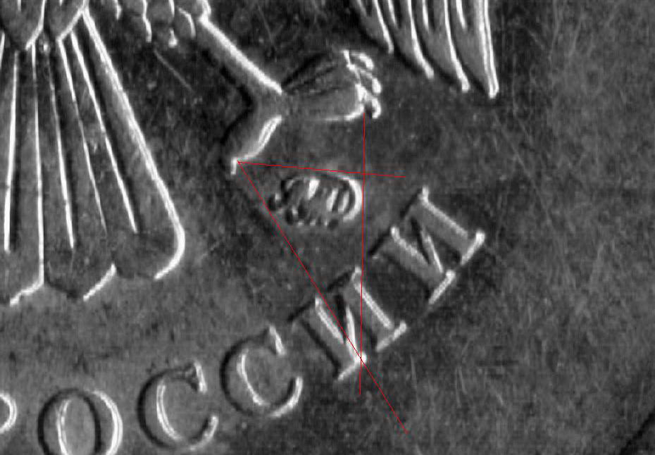 В таких случаях ("нестандартном" виде монограммы) всегда обращайте внимание на соседние элементы изображения. На Вашей монете детали монограммы слились, лапа, стойки букв в легенде и кончики перьев на крыле тоже "поплыли". Это хорошо заметно в сравнении с нормально прочеканенной монетой.