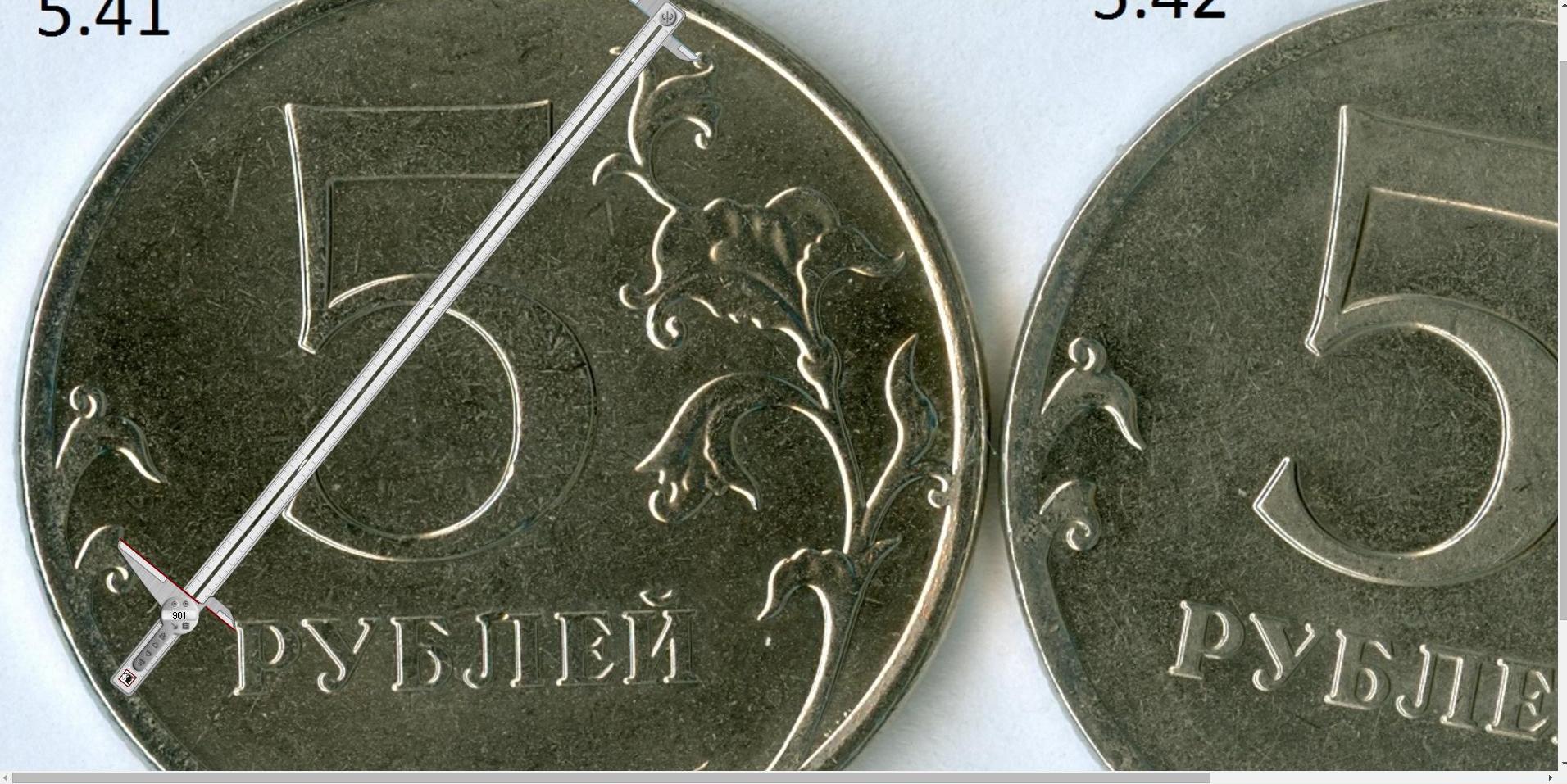 Не факт. При износе штемпеля это расстояние визуально уменьшается. Просмотрите личку, в свое время как замерять я Вам подробно расписывал. Можно замерять как на примере выше, можно выбрать и немного другие точки, главное, чтобы независимо от состояния монеты они сохраняли неизменное положение и были максимально удалены друг от друга. (http://www.aeol.su/forum/5-rub-2008-m-0#comment-15199)