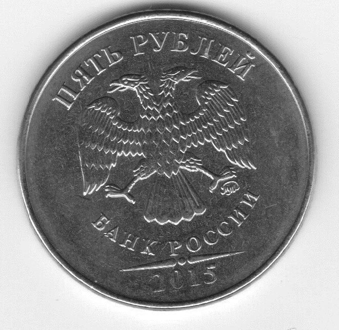 Здравствуйте! Уважаемые профессионалы помогите определить 5 рублей 2015 года. Цифра 5 вся объемная, верхняя часть пятерки сглажена, правый угол скощен, буквы в надписи "Рублей" сближены, толстые, кант средний. В каталоге описаний нет.