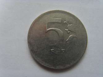 Попалась 5-ти рублевая монета с поворотом 180 градусов, хорошим непрочеканом с обеих сторон, полностью непрочеканенным гуртом. Масса монеты 5.97 грамм.
