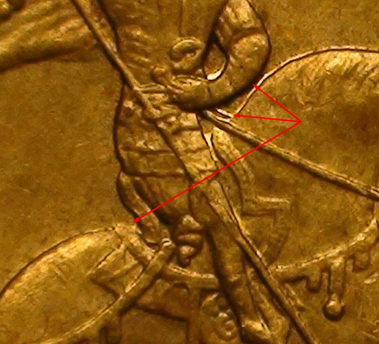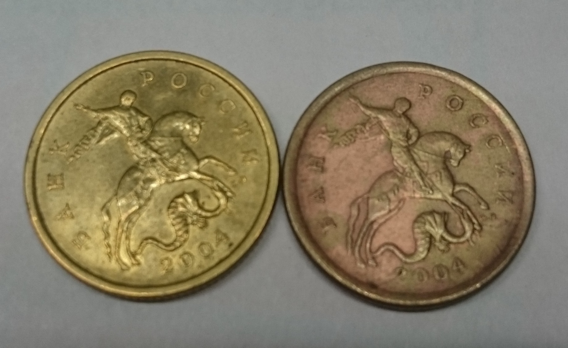 Попалась монета розоватого оттенка (может в другом металле?) - на фото справа