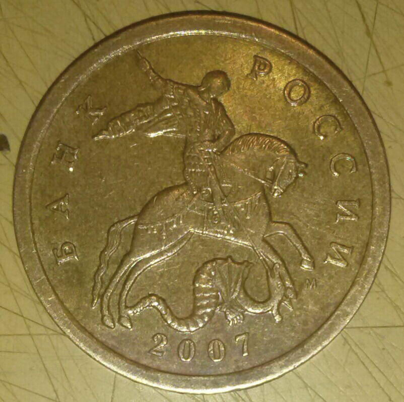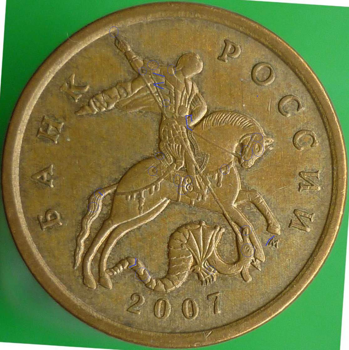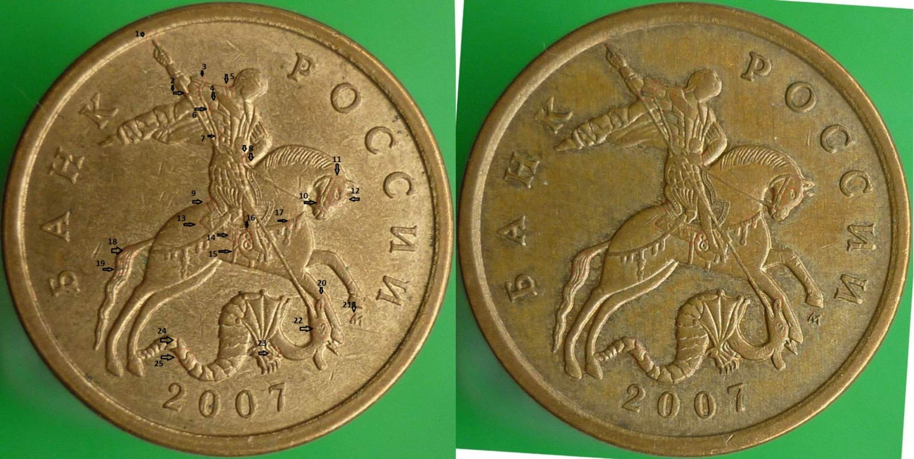 Вот, например, стрелка под №3 показывает на то, что на одной монете окантовка, проходящая по левому боку туловища Георгия доходит до верхнего края руки, а на второй монете - нет,
