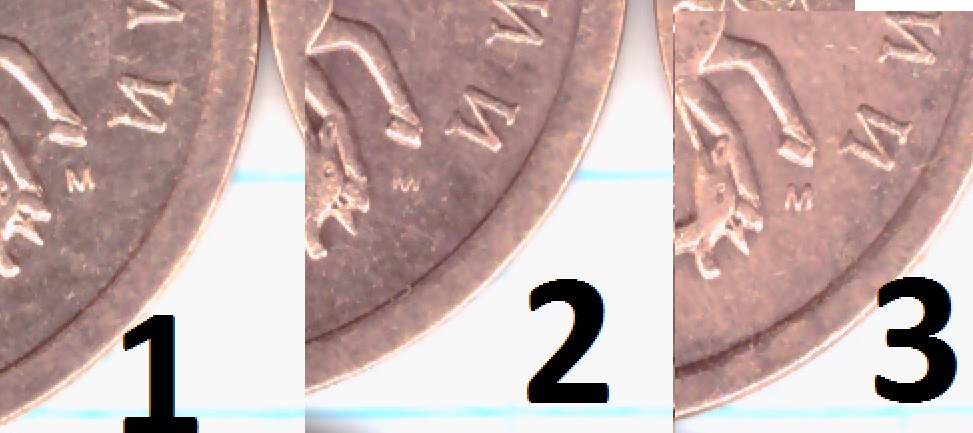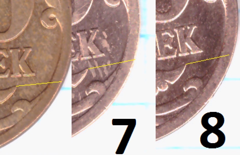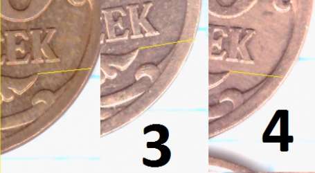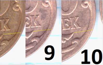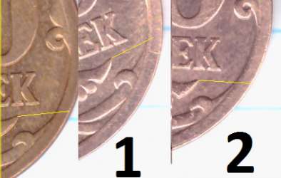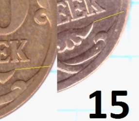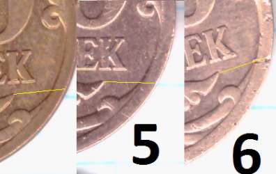 - у 1 монетки шлифовка в том же направлении, только в районе "5" номинала шлифовка идет сверху вниз