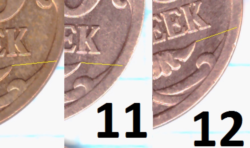 на 11 монетах есть эта черточка именно на этом месте, на трех других не вижу