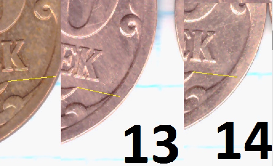 Просмотрел АВЕРС -все 14 монет №1, как на Вашем рисунке. Значит и Реверс у всех одинаковый, просто на 4 монетках слабо видно шлифовку!