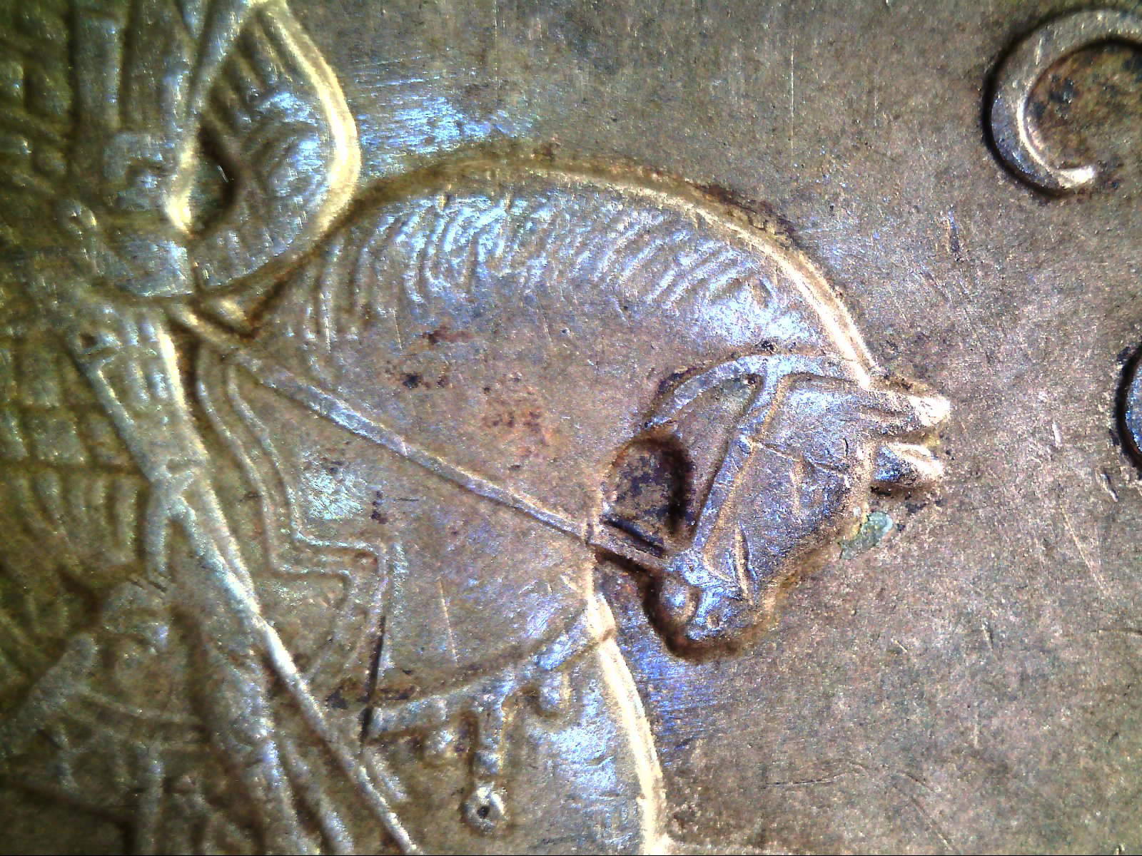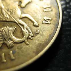 Добрый вечер! Как мне кажется, нашел еще одну монету с отличающейся монограммой "М", На этот раз заметил деталь, на которую раньше, по какой-то причине не обратил внимание - это поводья коня, расстояние между ними разное на монете "эталон" и представленных монетах. Так же, расстояние от надписей до канта на "отличающихся" монетах больше.