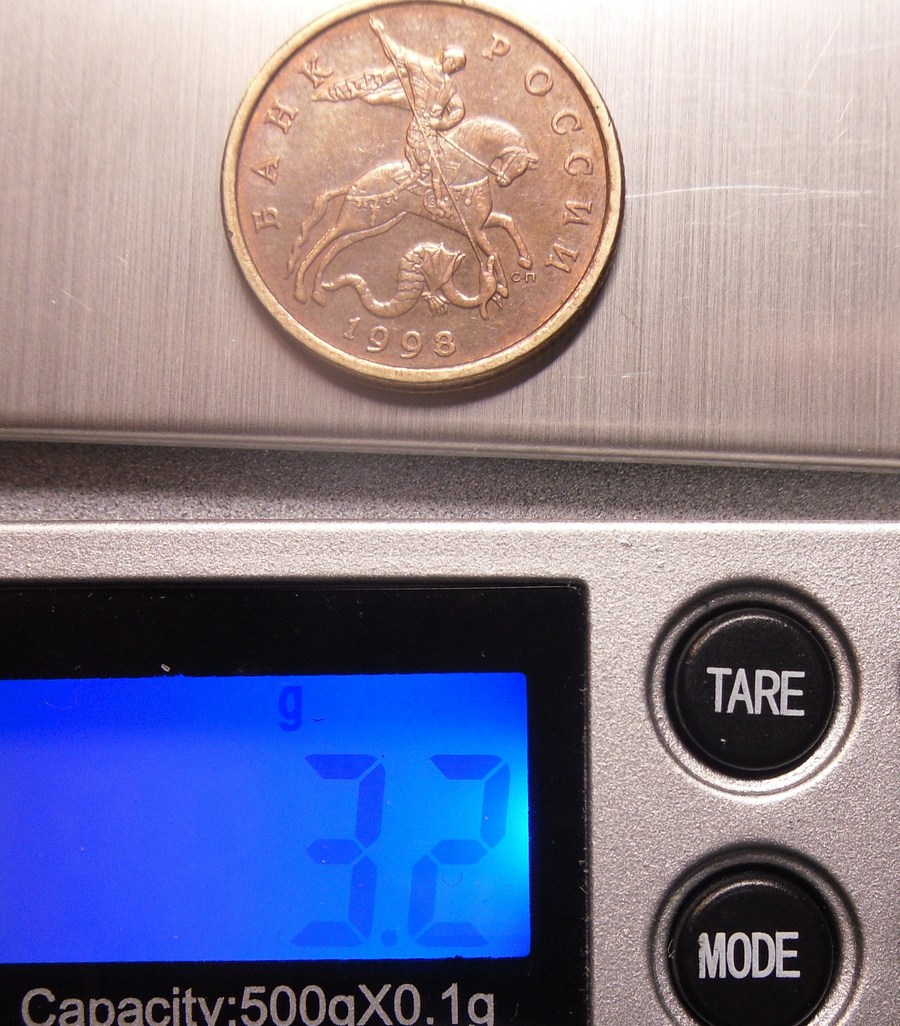При взвешивании монеты на таких весах (500гр х 0,1гр) погрешность может быть значительной. К уже заложенной производителем аппаратной погрешности в 0,1 гр добавляются неизбежные отклонения на крае диапазона взвешивания, ведь получается, что вес монеты меньше 1% допустимого. И кладите монету на центр площадки - измерительный кристалл находится точно по центру.