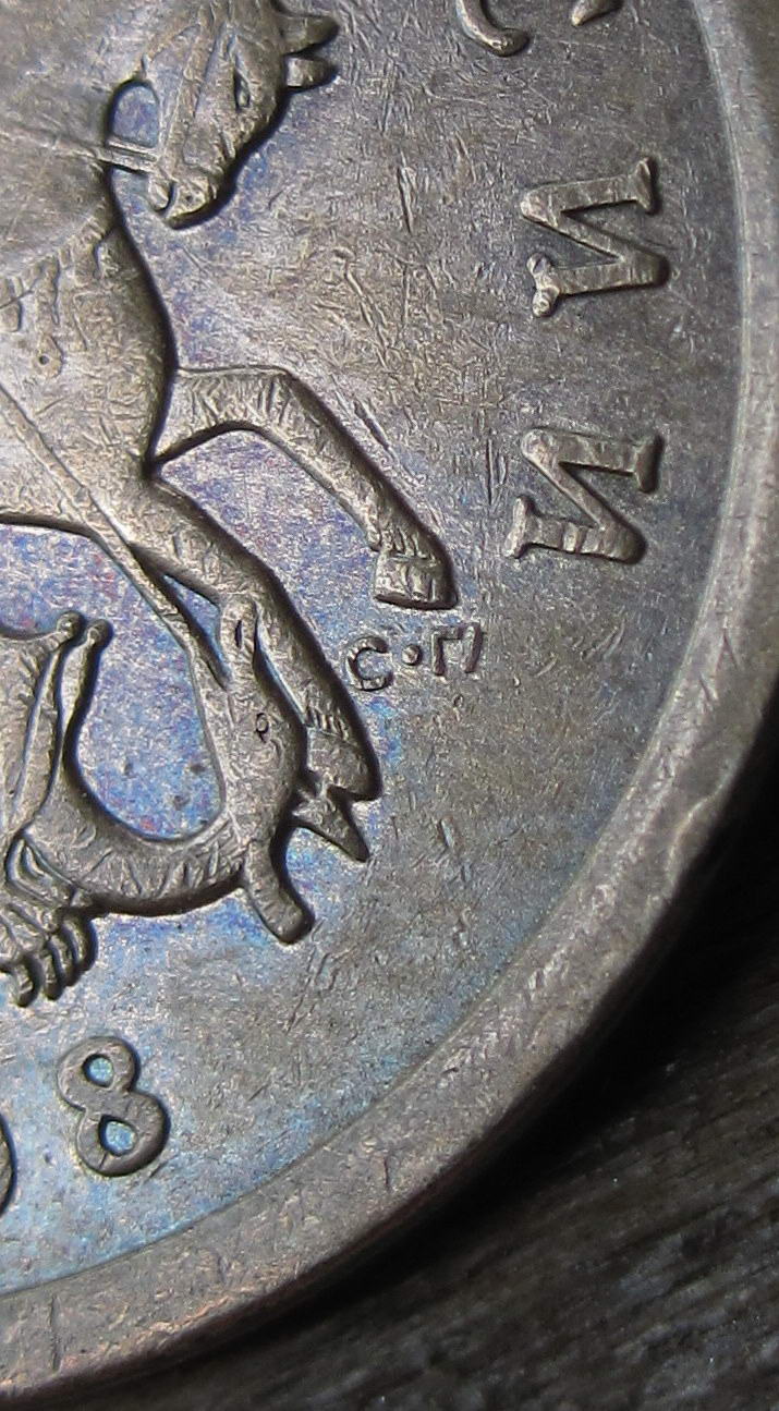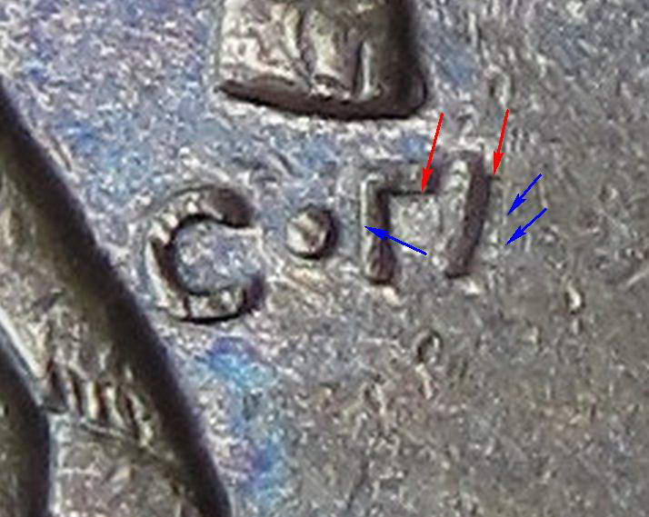 Александр, на увеличенном снимке очень хорошо видно, как ложатся тени (красные стрелочки) и блики (синие стрелочки). При таком их расположении напрашивается однозначный вывод: то, что Вы посчитали подгравировкой не выпуклость, а "впадина". На монете же след от подгравировки штемпеля может быть только выпуклым. Увы, это "травма", полученная в обороте.