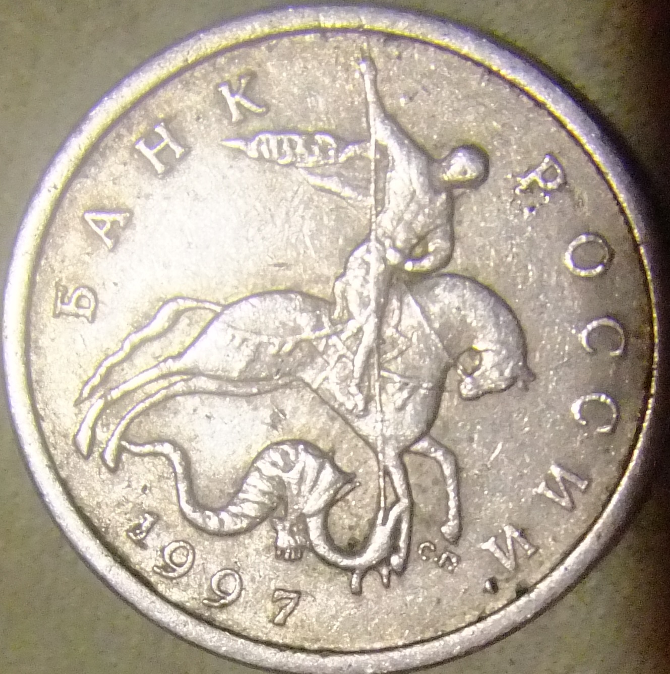 Простой Аверс. Игра света при повреждениях. Точка на месте, выше той которая рассматривается. Слева, над горизонтальной гастой буквы П потемнение, характерное при чеканке.