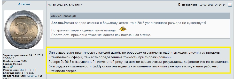 на САМАРЕ Аляска открыл 5 руб.2012 ММД -5.42 и сам же теперь говорит что НЕТ этой Разновидности!