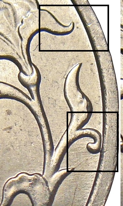 4. Монета так же видимо с браком - имеется четкая вертикальная совершенно ровная борозда между листами верхнего цветка - это я так понимаю засорение заготовки или штемпеля...?