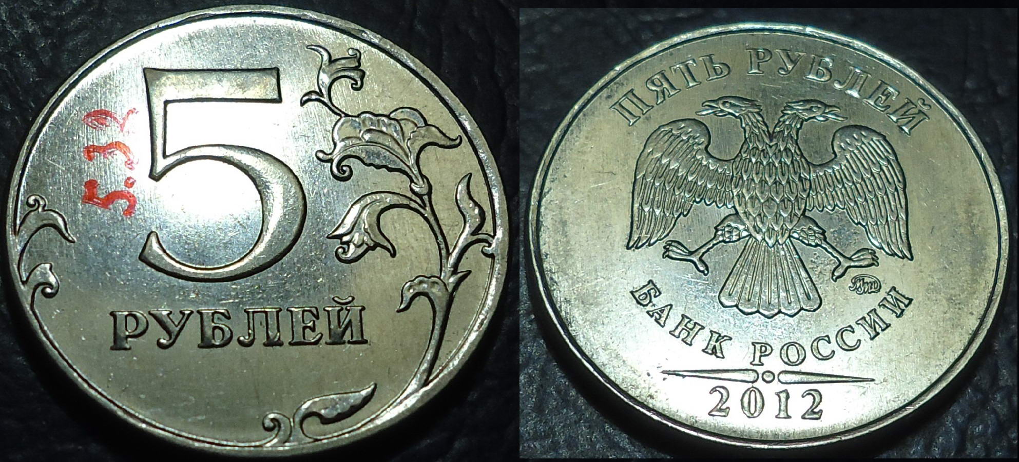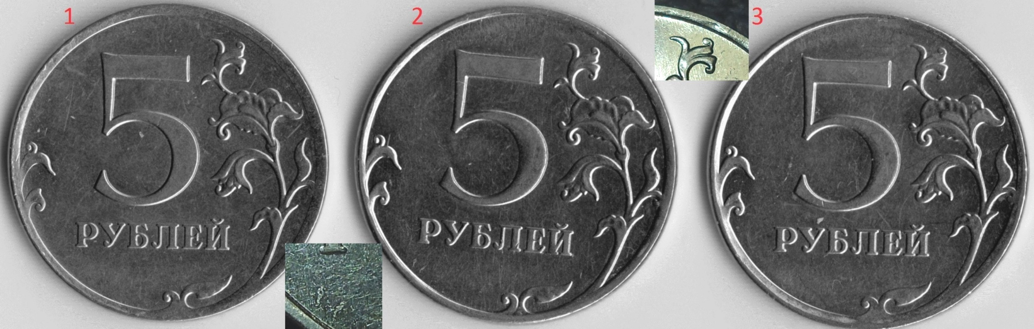 Величина поля и рельефный "масштаб" первого и третьего реверса (слева на право) идентичны. И как следствие соответствуют реверсу 5.31*. А "выпуклость" цифры номинала на третьем слева реверсе думаю связана с износом или засорением штемпеля.