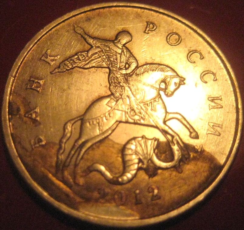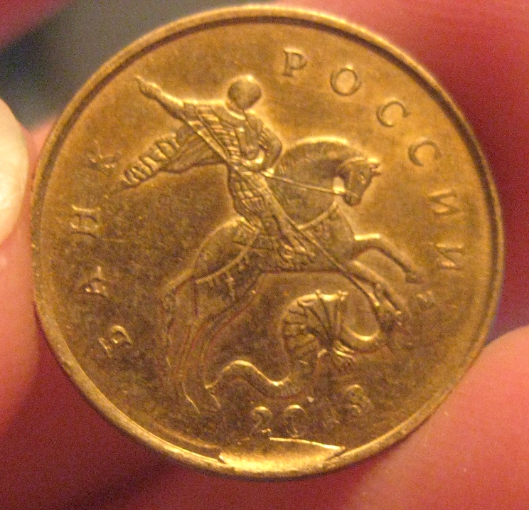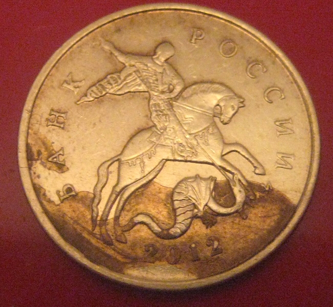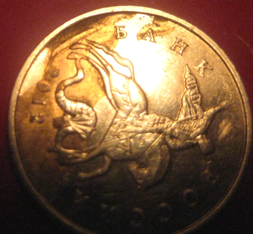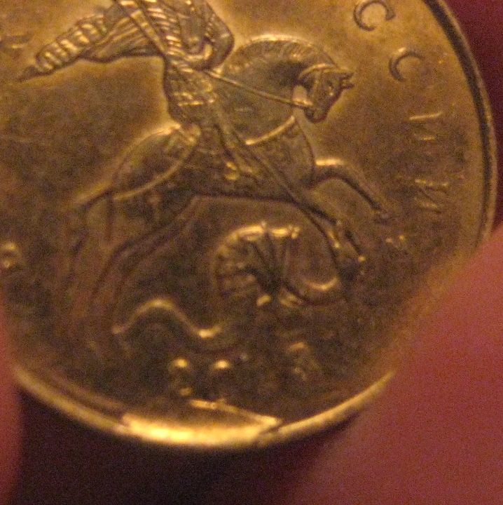 Монета кстати из мешка банковского,сначала ничем Не отличалась от других,потому как темная вся была,насторожила ямка на букве А в слове банка и границы этого пятна-они такие выпуклые,как расколы,на него сначала и подумала,Но когда помыла увидела это)