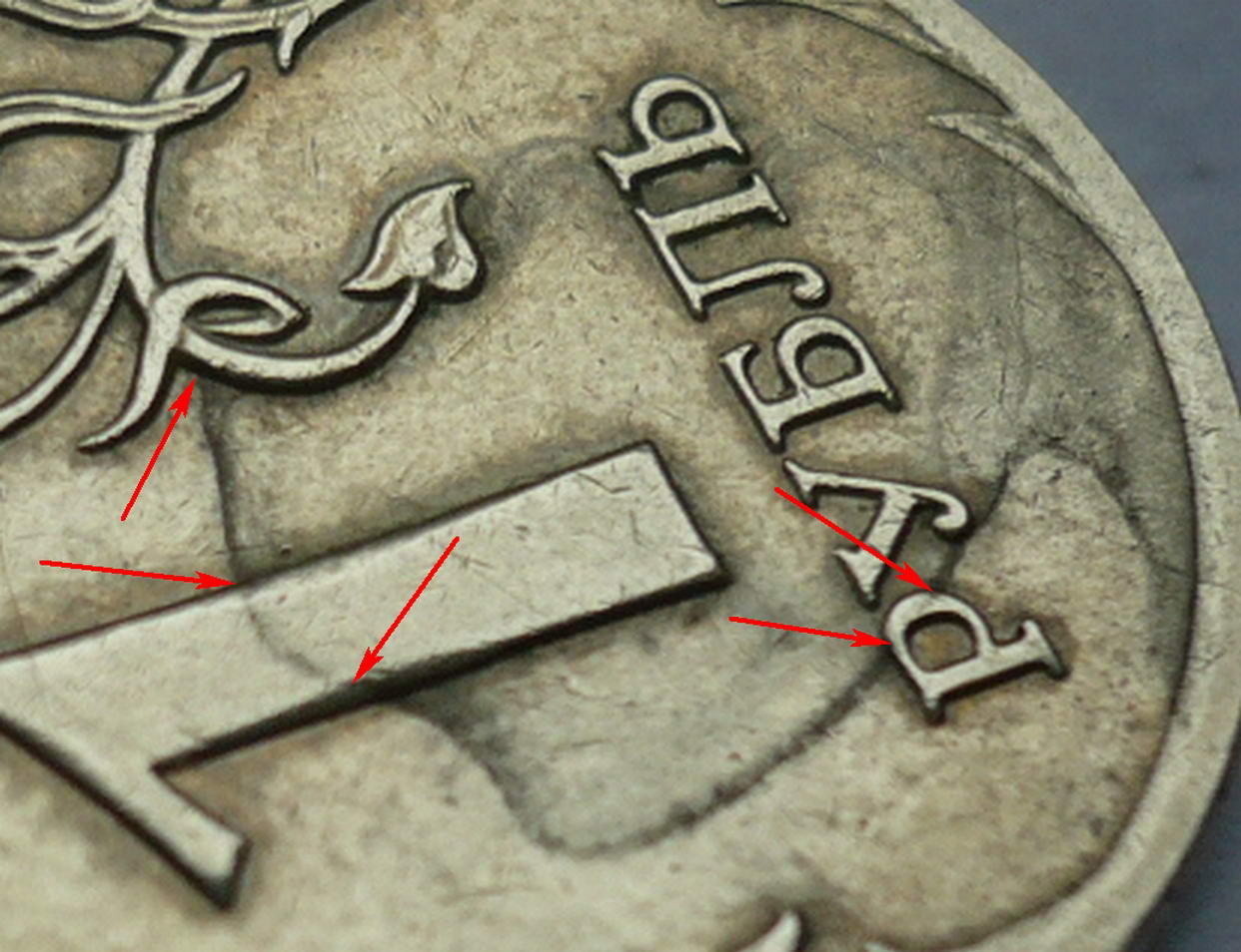 На поле и единице Вашей монеты наплыв канцелярского клея. Тот же совет, что и Денису, - ковырните или вдарьте молотком. О результатах эксперимента можете не сообщать, - они предсказуемы на 100%.