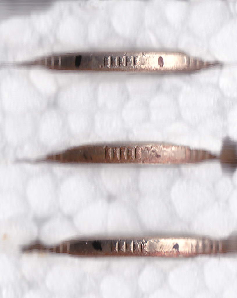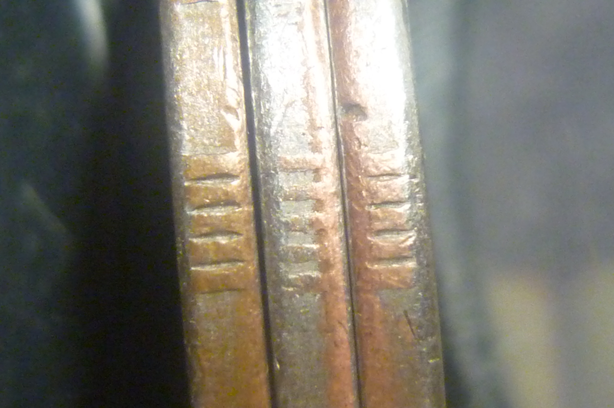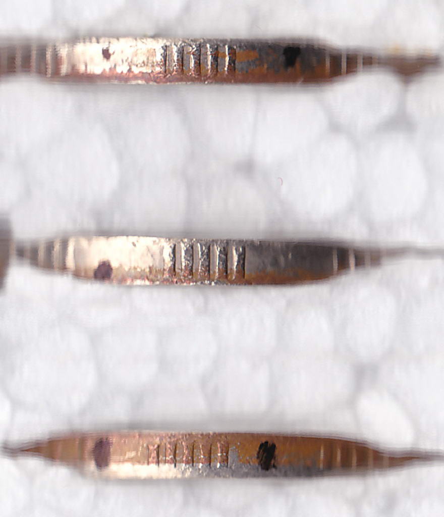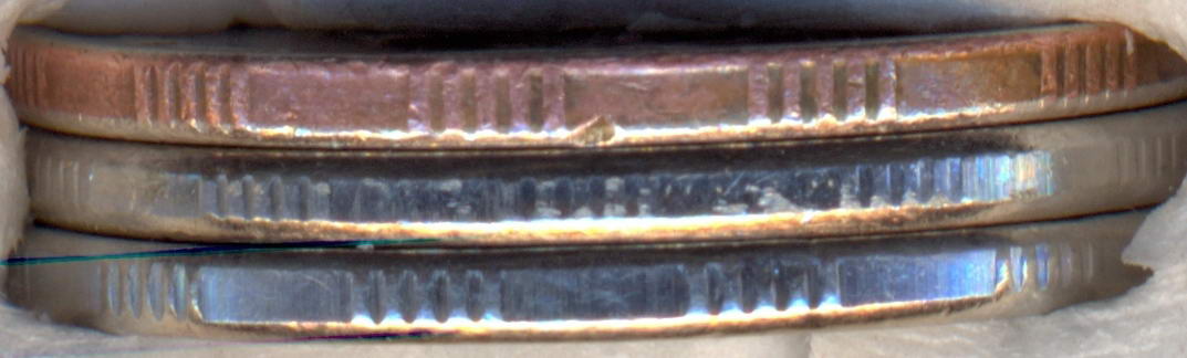 В указанные выше диапазоны пятирифовых участков по типам просечек попадает большинство, но не все монеты с гуртом типа I-II. Встречаются монеты, где просечки второго типа присутствуют и на одном участке. И монеты, где на одном из пятирифовых участков отнести просечки к первому типу уже язык не поворачивается, но и вторым можно назвать пока еще с натяжкой, а на следующем участке уже происходит обратный возврат к первому типу. И как разрешить или обойти проблему №2 - пока не ясно, но без ее устранения дальнейшее продвижение невозможно.