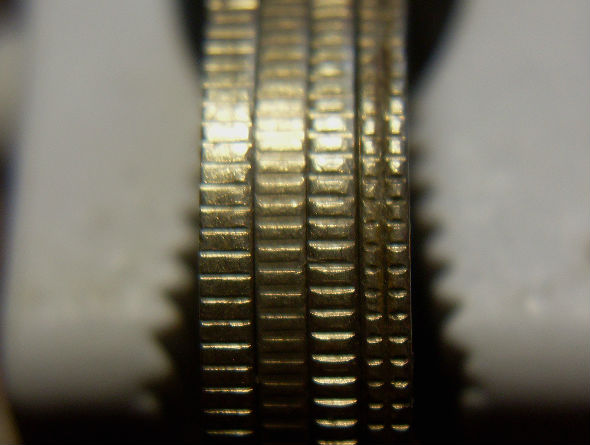 "Дело в том, что мои изыскания немного не стыкуются с таблицей в ранее упомянутой ссылке. Монеты, имеющие 113 насечек, встречаются в 1961 и 1962 годах. В 1961 году они встречаются крайне редко, а в 1962 году найти их вполне реально. Еще существуют монеты 1976 года, имеющие на гурте 104 насечки. Монеты, имеющие 112 насечек у меня есть в наличии с 1965 по 1970гг., 1972г., и с 1976 по 1979гг. 111 насечек я нашел на монете 1974г. и на монетах с 1976 по 1991гг. В вашей таблице монеты, имеющие 111 насечек, присутствуют с 1965 по 1991гг. кроме 1969 и 1973гг. Теперь у меня к Вам вопрос: на ваших монетах 1966,1967,1968гг. действительно 111 насечек или их просто больше, чем 104. Как выглядят насечки, я не могу описать. Я их просто считаю. Александр Широков в описании вашей совместной таблицы сообщает, что насечек должно быть непременно 111 или 104, ну и еще 103 немножко. Конечно, если взять монеты со 104 и со 111 насечками и сложить вместе, то очень быстро можно убедиться в несовпадении насечек. Если же взять монеты со 111 и со 112 насечками, то надо крепко прижав монеты друг к другу провернуть их не менее, чем на 270 градусов. Если Вы возьмете любую монету (на которой больше 104 насечек) примерно до 1970г. и любую монету после 1980г., то при аккуратном проворачивании (не сдвигая монеты относительно друг друга) Вы обязательно обнаружите несоответствие насечек"."
