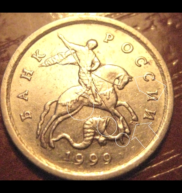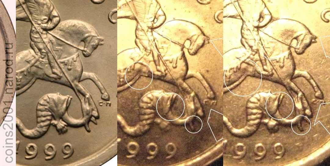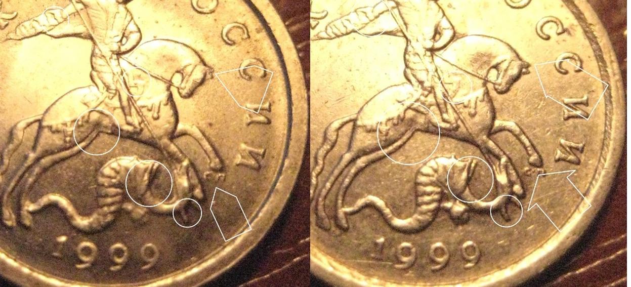 Все различия,которые увидела-обвела,правильно объясняться терминами Не умею,поэтому как могу...:на левой между СП почти нет точки(ну спишем на непрочекан),дальше...складка правой ноги выше чем у соседней копейки,УШИ,обратите внимание на уши (смотрим на левую копейку) они закругленные и Не разделены!под всадником седло с рисунком,на правой копейке нет,теперь о змее-обратите внимание на уши или как там они у него называются?на левой-прямо почти,а на правой сильно загнуто вверх,ну об остальном Не буду-так мелочи....