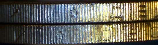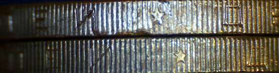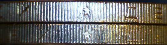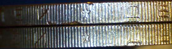 Верхняя монета - это та которая с укороченной надписью? На ней по Ь видно, что монета застревала во время накатки.