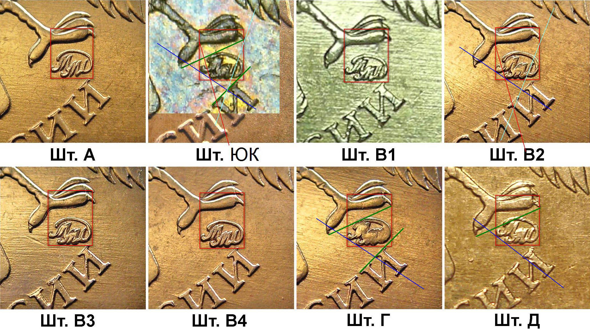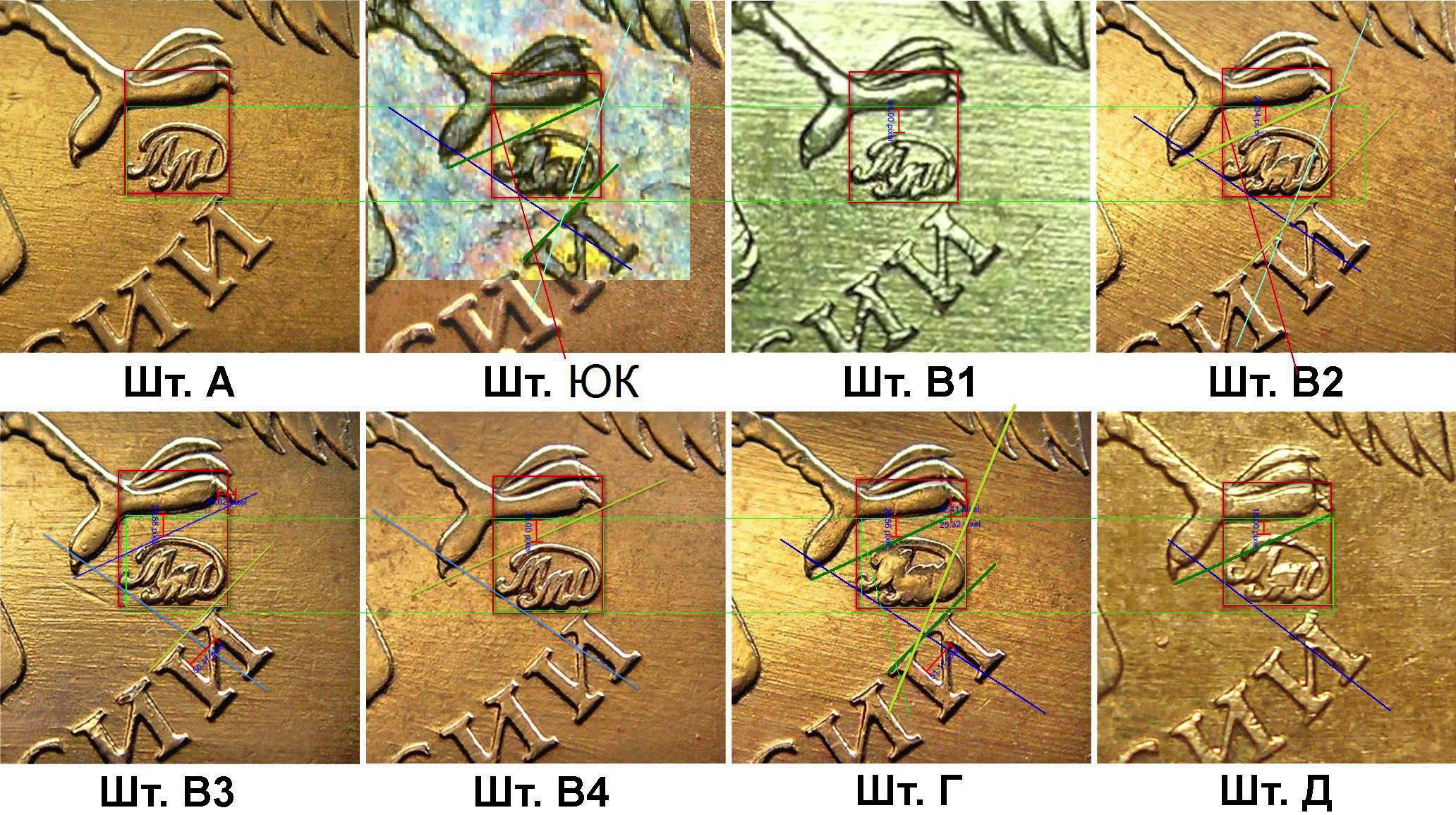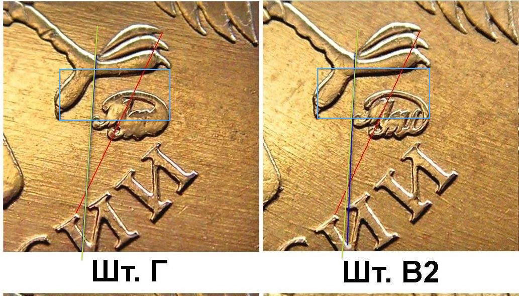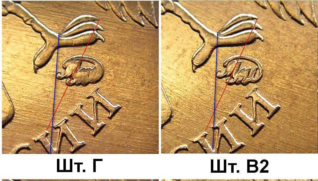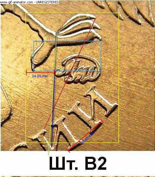 Грешит. Но, хотя линовка и прикидочная, отличия с В2 все же заметны. А если еще принять во внимание, что при видимом внешнем диаметре монет 450 пикселей (сравнивал фото монеты здесь и фото шт. 1.23В на сайте ЮК) разница в расстоянии между центром глаза орла и центром точки внизу составляет 6 пикселей, то есть масштаб меньше известных одноштемпельных, то можно говорить и о штемпеле более раннего поколения. Да и разная ширина канта бросается в глаза. Но ждем качественных сканов и шлифовку.