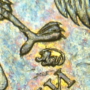 Я сделал коллаж, немножко порисовал и пришел к выводу, что с определением штемпеля этой монеты есть определенные проблемы. Наиболее близкий по расположению штемпель указал Валерий, но это только близкий. А для Вашего еще и обозначения в каталогах нет, так что помочь с определением монеты, уж извините, не получится.
