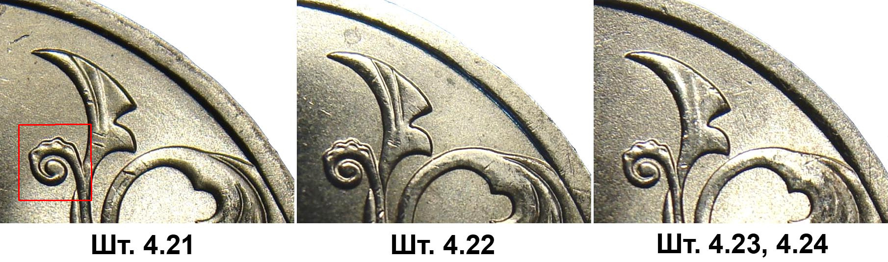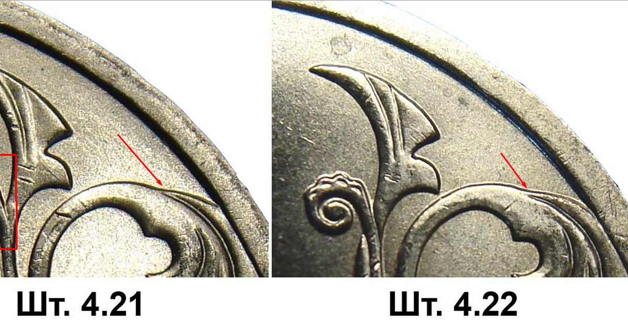Я как раз вчера смотрел эти монеты, штемпеля были разные, в т.ч. весьма убитые, но ни один из завитков не подвёл