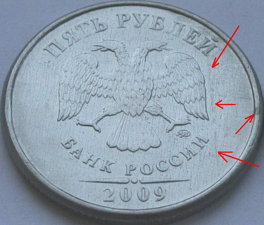 Как мог показал цвет царапины на гурте. Для сравнения поцарапал также стандартные 5 рублей 2009 сталь.