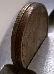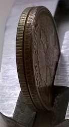 На наружнем диаматре изделия, наносить насечки (риски) проще подающим резцом или вращающейся фрезой. Но так как у гуртового кольца насечки внутренние, они могут сделаны методом 'долбёжки' либо 'протяжкой' (второе дешевле). И то и другое определяет ткачество изделия. Ведь вид гурта, в конечном итоге отличается от качаства (износа) первичного инструмента. А теперь взгляните на гурт от Т.С., расстояние между 'рифами' разнятся по всей (показаной) поверхности. Вывод: это сделано однокатковой накаткой без учёта диаметра монеты и самого катка.