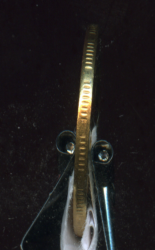 Вот еще одна желтая. Из оборота. Весовые и геометрические данные соответствуют родной заготовке для данной монеты. Желтизна равномерная по всей монете. Присутствует и внутри царапин и забоин, полученных в обороте.