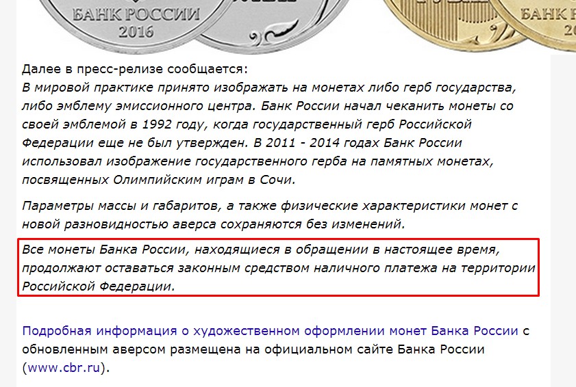 Банк России сообщает, что начиная с 2016 года чеканки на аверсах всех монет, в оформлении которых в настоящее время используется эмблема Банка России, будет размещаться изображение Государственного герба Российской Федерации.