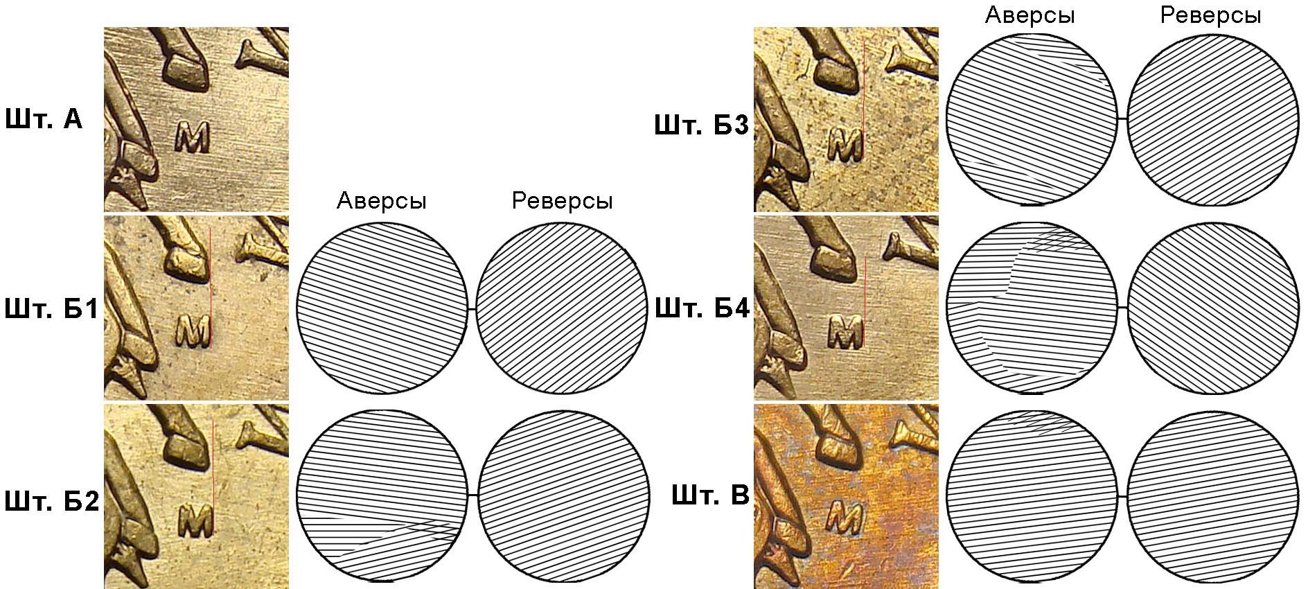 Ниже в дополнение приведены фотографии всех аверсов 50 к. 2010 м. Варианты Б3 и В значительно чаще встречаются с выкрошками штемпеля внутри буквы М, при этом сама буква и является определяющим признаком, поэтому варианты этих штемпелей приведены как выкрошкой, так и без. В дальнейшем фото этих "бракованных" вариантов будут помещены в примечания к спецкаталогу.