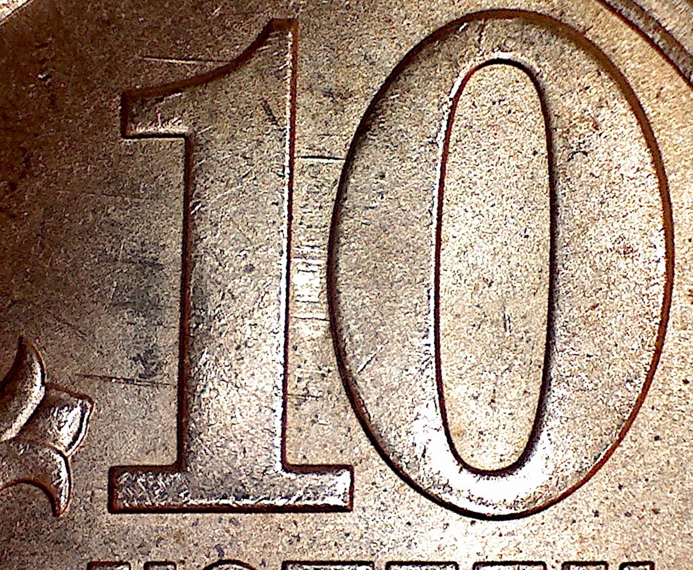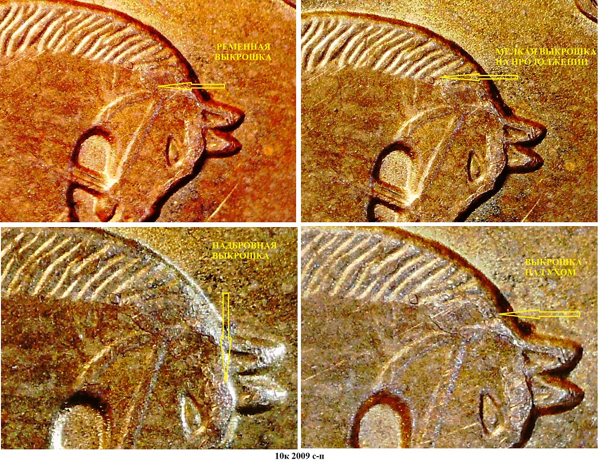 М.б. действительно выкрошка, либо подправили какой-то дефект штемпеля, как на 50 к. 2003 с-п 2.213? Как определить истину? Только просмотром всех доступных экземпляров 10 к. 2010 с-п и сличением характерных линий шлифовки с вышеописанным экз.